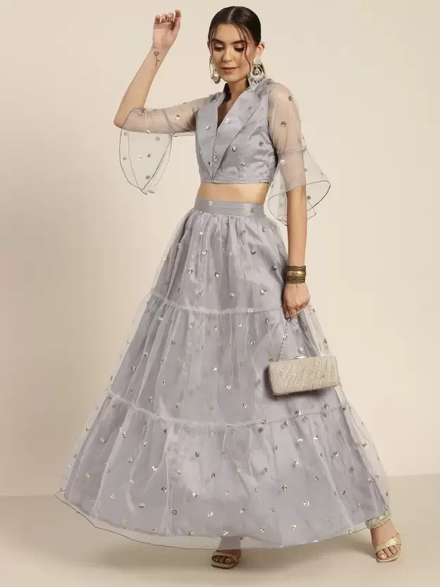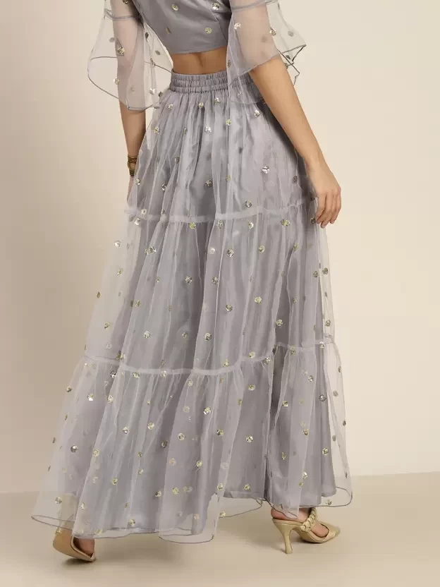 Steel Grey Tulle Sequins Tiered Skirt, in Mesh Net fabric, Polyester Lining, Ankle Length, Fit & Flare, Elastic At Back Waist, Flared Hemline and features Tier Detail In Skirt
