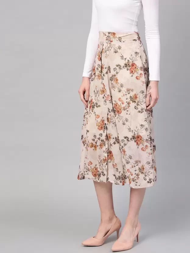 Taupe Floral A-Line Skirt , in Georgette fabric, Polyester, Midi Length , Fit & Flare, Elasticated waist line , Flared Hemline and features Mock Bottom Placket At Front