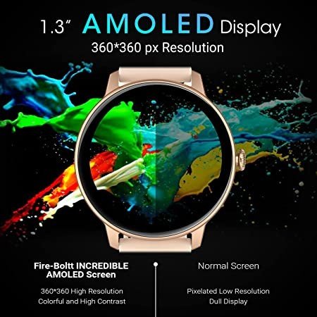 1.3" AMOLED Display - Fire-Boltt Incredible has a premium 360*360 Pixel Resolution and 1.3" AMOLED Display which comes with the Always On feature. The AMOLED provides incredible performance. It is thinner, lighter, flexible and one of the safest display technologies ever developed.