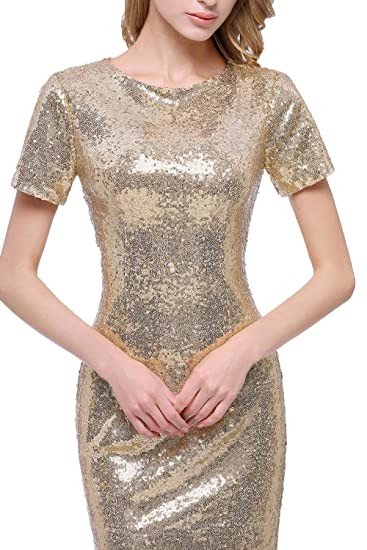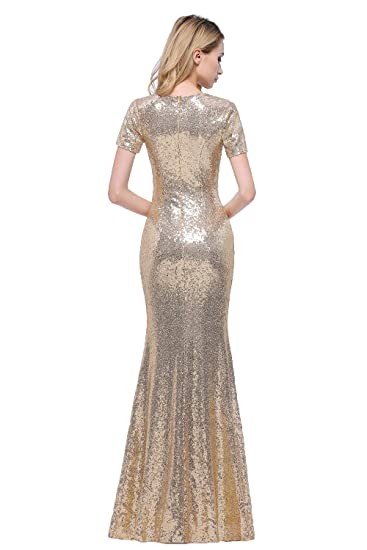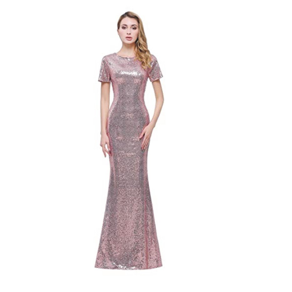 honey qiao Short Sleeves Bridesmaid Dresses Long Sequins High Back Sequence Evening Party Gowns