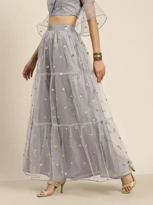 Steel Grey Tulle Sequins Tiered Skirt, in Mesh Net fabric, Polyester Lining, Ankle Length, Fit & Flare, Elastic At Back Waist, Flared Hemline and features Tier Detail In Skirt