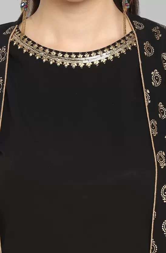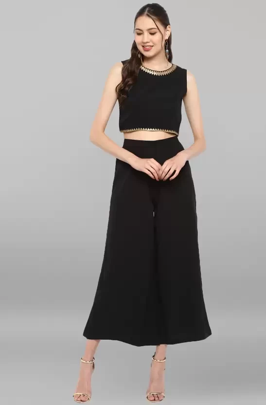 Be the cynosure of all eyes by wearing TopPalazzo set by Janasya. This Black color kurta set is crafted from Poly Crepe fabric, has a Round Neck, 3/4 Sleeve, has Crop Top silhouette of length 17,47�. It is light in weight and will be soft for your skin. The Palazzo has Partially Elasticated waistband with No Pocket and is Black in color with 39� length. This suit set has a soothing color and will lend you a fresh look this season. Style this kurta set with this season's most coveted heels or flats for a trendy look.