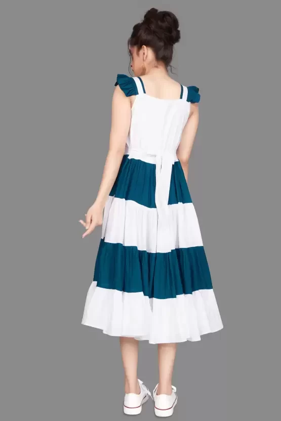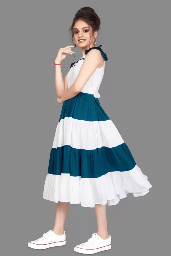 "Spruce up your wardrobe with this midi length dress from Fashion Dream available on flipkart. This fit and flare dress has color block tier pattern as pattern type and is perfect for a day out with friends or a nigh get-togethers with family. This midi length white and blue dress is made with crepe fabric, which is soft and smooth. It features a square neck with beautiful stylish cap sleeves in it and skirt with tiers pattern. Self fabric belt with this dress is for fitting. This stunning fit and flare dress is especially made for summer and spring season."