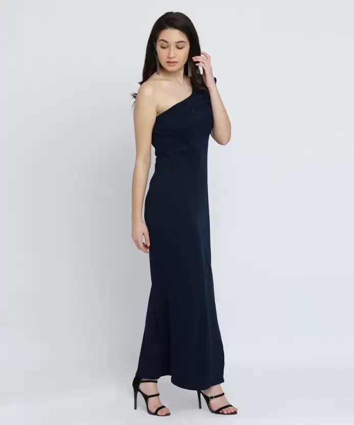 Navy blue knitted cotton solid ruffled slim fit one shoulder maxi dress, Is sleeveless and has a zip closure