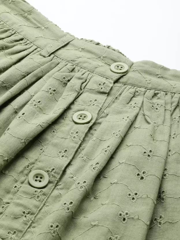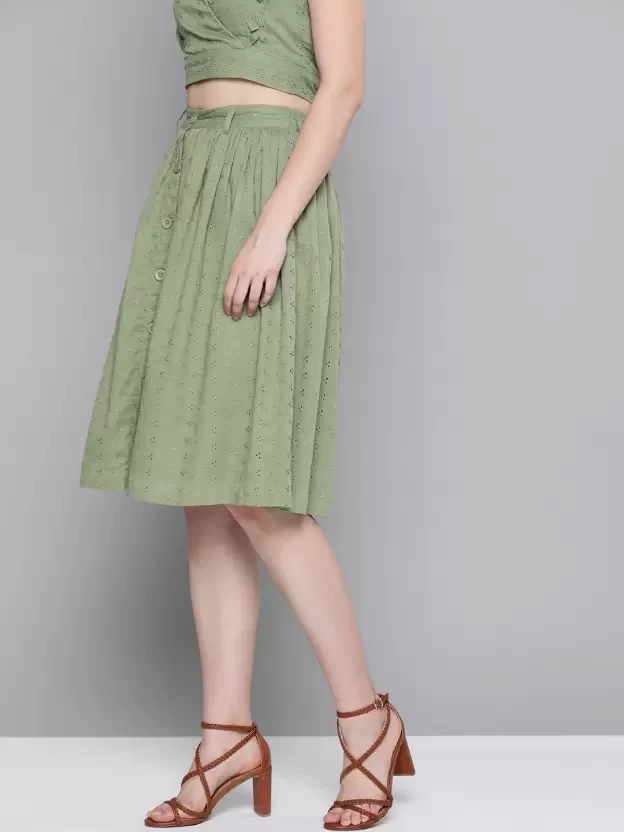 Olive Schiffli Buttoned Skirt, in Schiffli Lace fabric, Cotton Lining , Knee Length, Comfort Fit, Button Closure, Flare Hemline and features Placket At Front